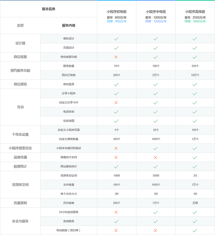 根據(jù)功能不同,我公司小程序有三個(gè)版本,價(jià)格分別為:800元(續(xù)費(fèi)400元),1200元(續(xù)費(fèi)1000元),2500元(續(xù)費(fèi)1800元),以上價(jià)格為已有認(rèn)證微信公眾號(hào)的報(bào)價(jià),如需代理開(kāi)通微信公眾號(hào)首年另加500元 詳細(xì)功能介紹 >>
